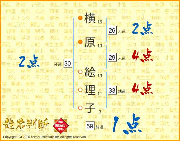 横(16画)原(10画) 絵(19画)理(11画)子(3画)