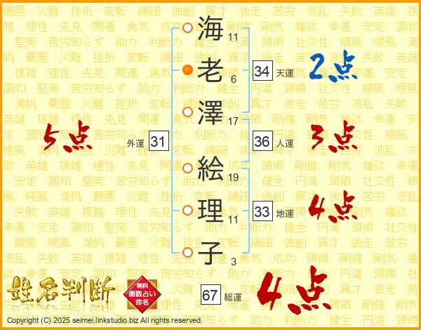 海(11画)老(6画)澤(17画) 絵(19画)理(11画)子(3画)
