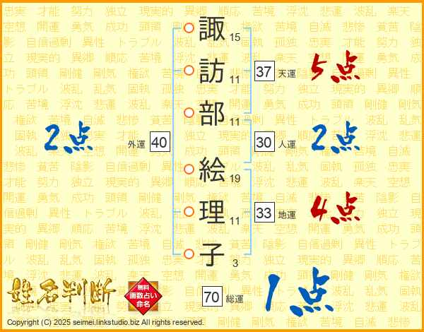 諏(15画)訪(11画)部(11画) 絵(19画)理(11画)子(3画)