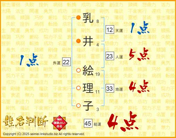 乳(8画)井(4画) 絵(19画)理(11画)子(3画)