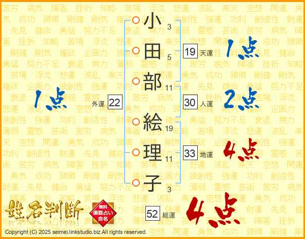 生活面を象徴する運勢です。外部から受ける影響力を表し、結婚運、家庭運や職場、環境への順応性を表します。総運から人運を引いた画数。姓や名が1文字の場合を除く。