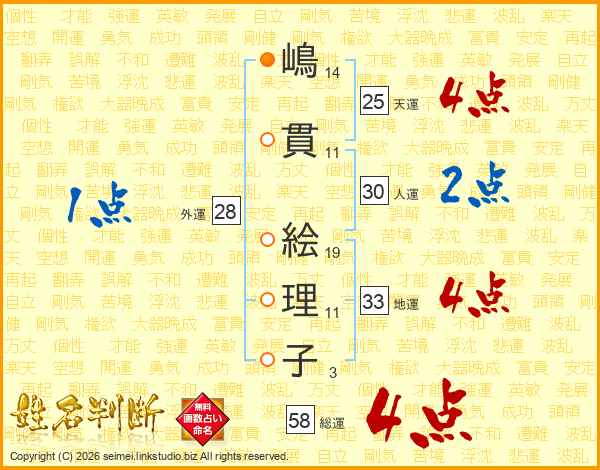 嶋(14画)貫(11画) 絵(19画)理(11画)子(3画)