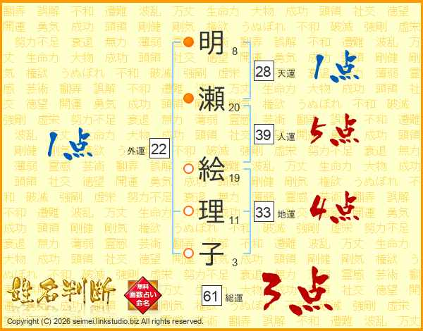 明(8画)瀬(20画) 絵(19画)理(11画)子(3画)