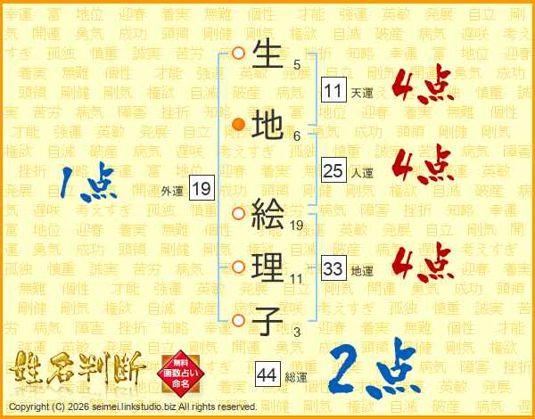 生(5画)地(6画) 絵(19画)理(11画)子(3画)