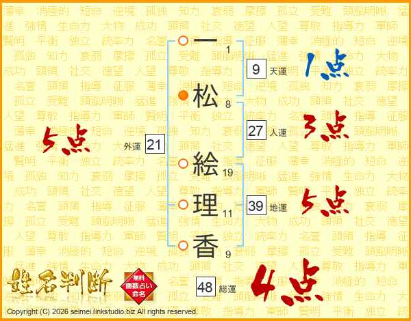 一(1画)松(8画) 絵(19画)理(11画)香(9画)