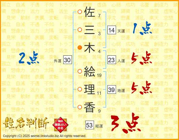 佐(7画)三(3画)木(4画) 絵(19画)理(11画)香(9画)