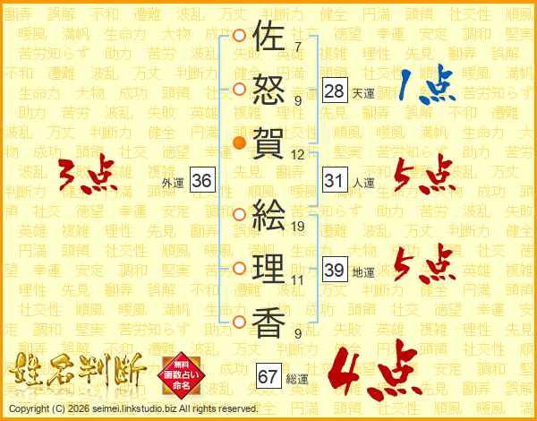 佐(7画)怒(9画)賀(12画) 絵(19画)理(11画)香(9画)