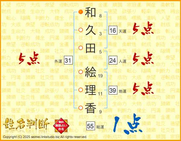 和(8画)久(3画)田(5画) 絵(19画)理(11画)香(9画)