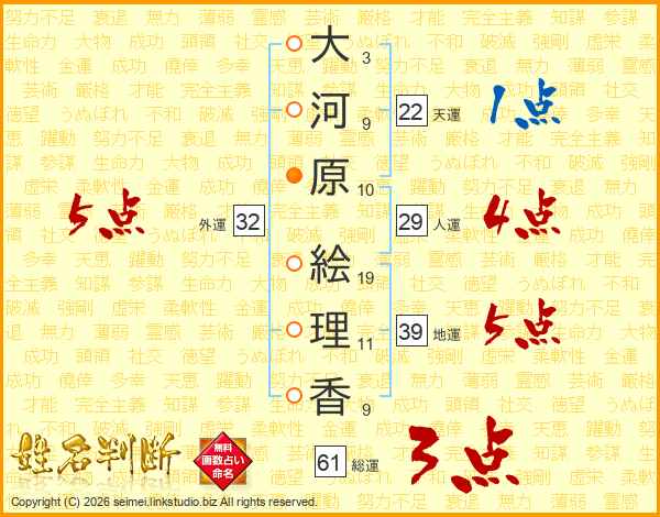 大(3画)河(9画)原(10画) 絵(19画)理(11画)香(9画)