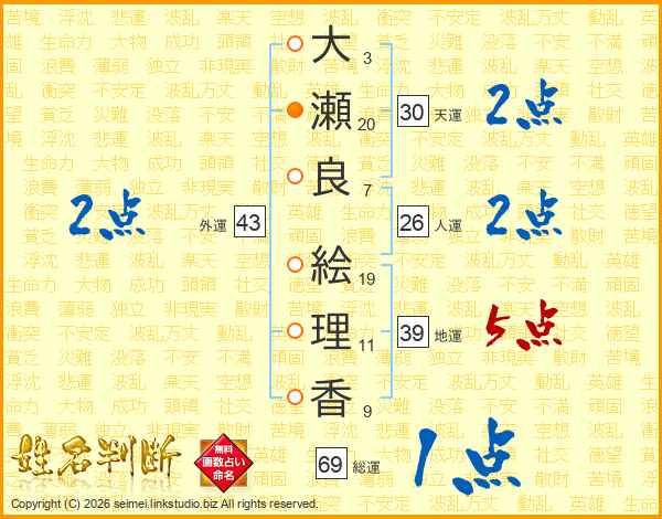 大(3画)瀬(20画)良(7画) 絵(19画)理(11画)香(9画)