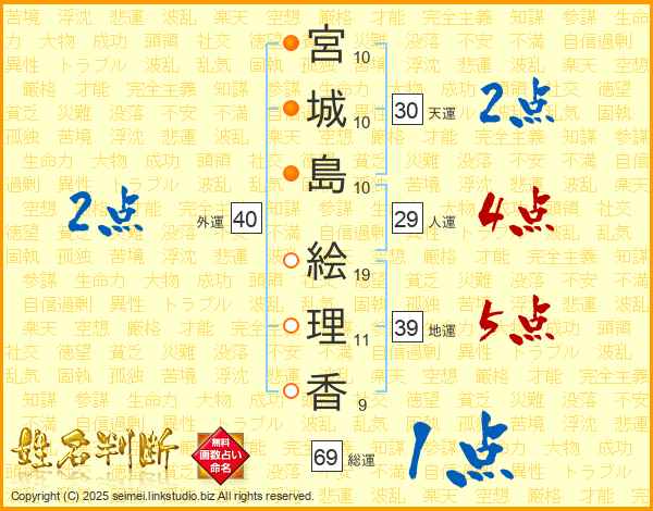 宮(10画)城(10画)島(10画) 絵(19画)理(11画)香(9画)