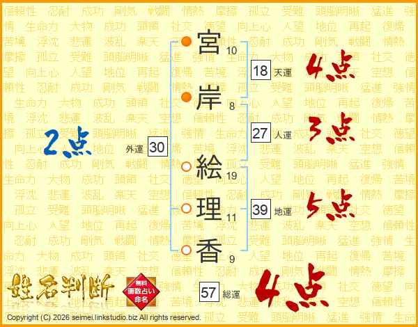 宮(10画)岸(8画) 絵(19画)理(11画)香(9画)