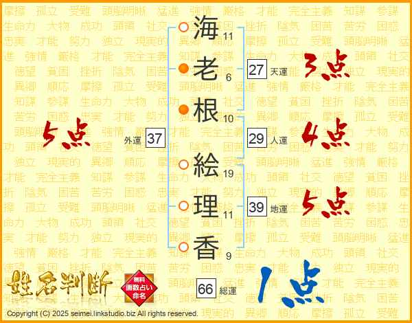 海(11画)老(6画)根(10画) 絵(19画)理(11画)香(9画)