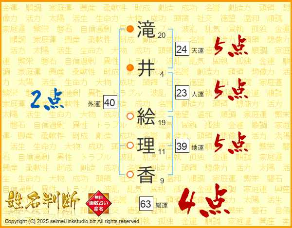 滝(20画)井(4画) 絵(19画)理(11画)香(9画)