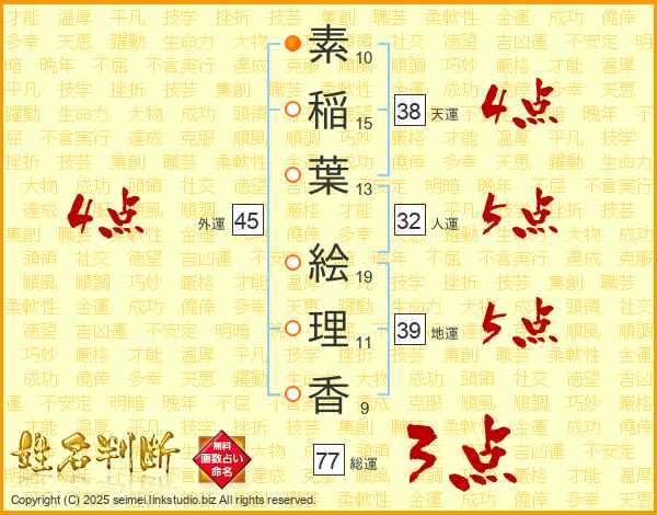 素(10画)稲(15画)葉(13画) 絵(19画)理(11画)香(9画)