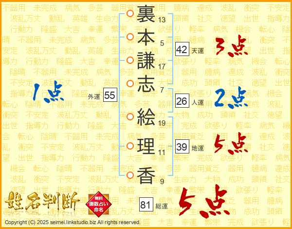 裏(13画)本(5画)謙(17画)志(7画) 絵(19画)理(11画)香(9画)