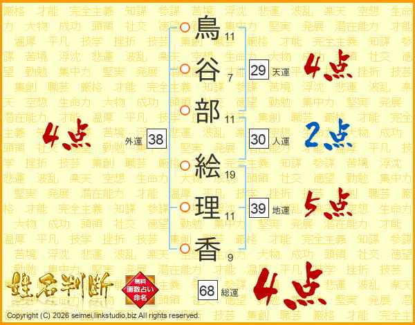 鳥谷部絵理香さんの総運は68画の4点!