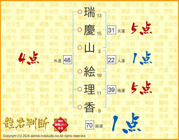 瑞(13画)慶(15画)山(3画) 絵(19画)理(11画)香(9画)