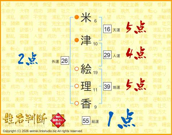 米(6画)津(10画) 絵(19画)理(11画)香(9画)