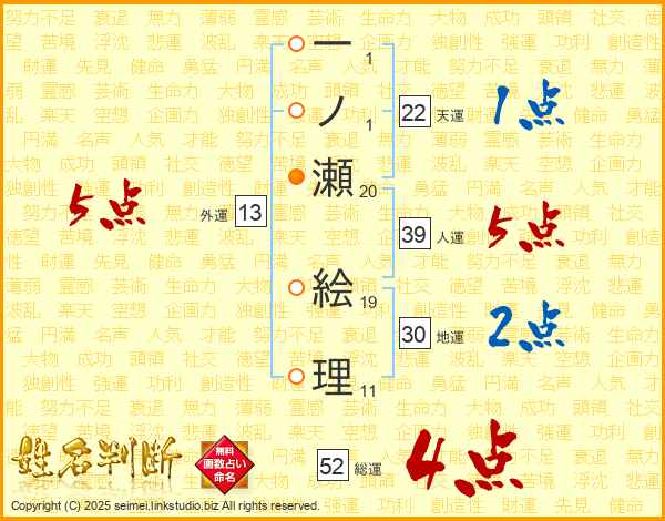 一(1画)ノ(1画)瀬(20画) 絵(19画)理(11画)