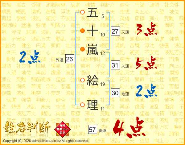 五(5画)十(10画)嵐(12画) 絵(19画)理(11画)