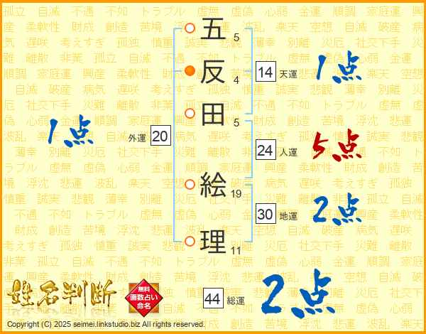 生活面を象徴する運勢です。外部から受ける影響力を表し、結婚運、家庭運や職場、環境への順応性を表します。総運から人運を引いた画数。姓や名が1文字の場合を除く。