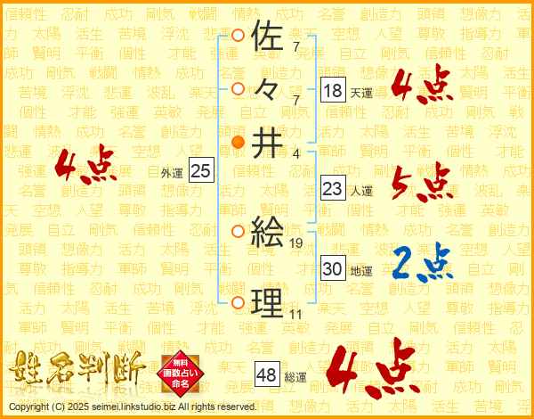佐(7画)々(7画)井(4画) 絵(19画)理(11画)