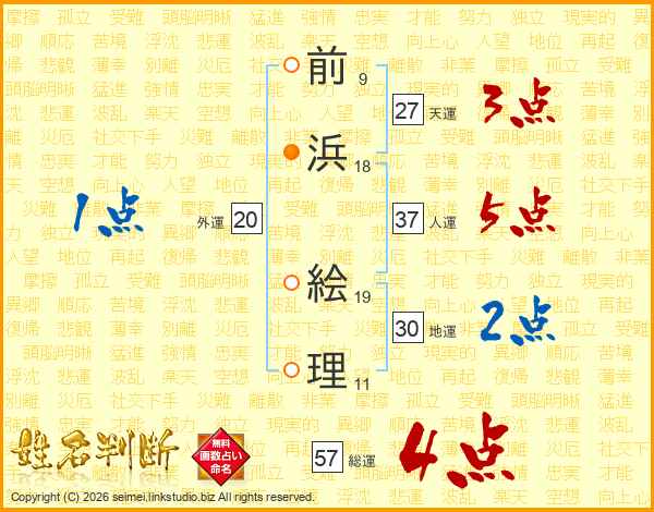 前(9画)浜(18画) 絵(19画)理(11画)