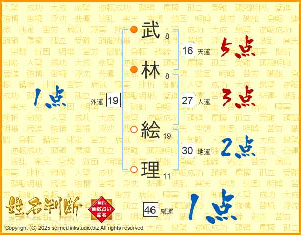 武(8画)林(8画) 絵(19画)理(11画)