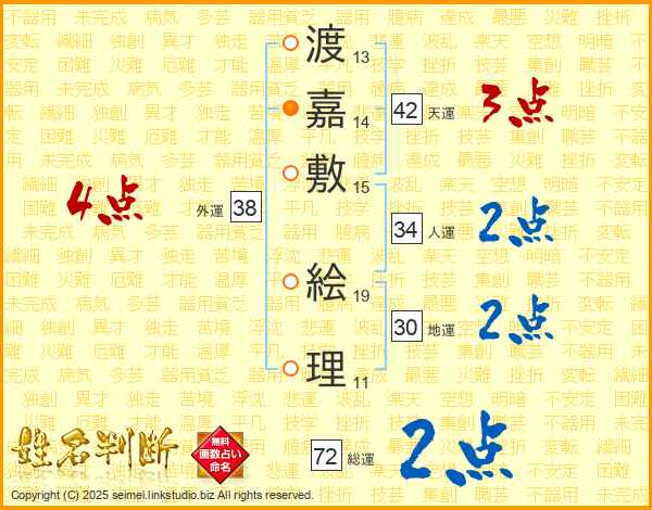 渡嘉敷絵理さんの総運は72画の2点!