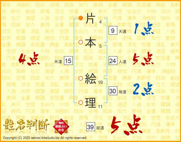 あなたの人生を表す1番重要な運勢です。生涯を通じて影響する総合運となり、主に50歳以降の晩年期に影響を及ぼします。苗字と名前の合計画数。