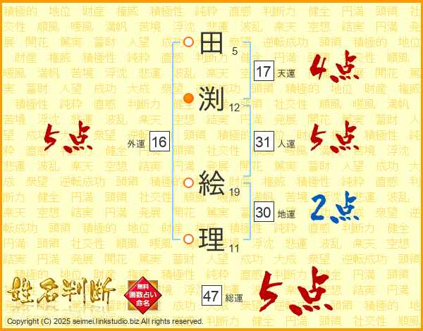 生活面を象徴する運勢です。外部から受ける影響力を表し、結婚運、家庭運や職場、環境への順応性を表します。総運から人運を引いた画数。姓や名が1文字の場合を除く。
