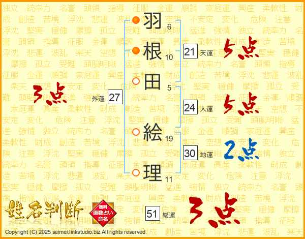 羽(6画)根(10画)田(5画) 絵(19画)理(11画)