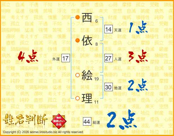 画数の奇数(○陽)と偶数(●陰)の配列で吉凶を占います。どちらかにかたよる名前は大凶名で避ける必要があります。画数の奇数偶数。