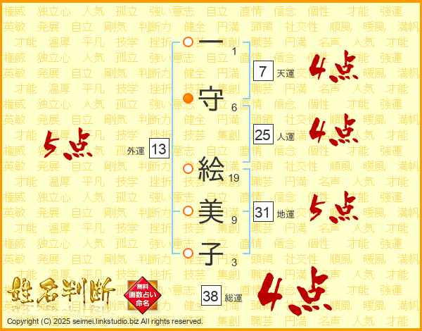 一(1画)守(6画) 絵(19画)美(9画)子(3画)