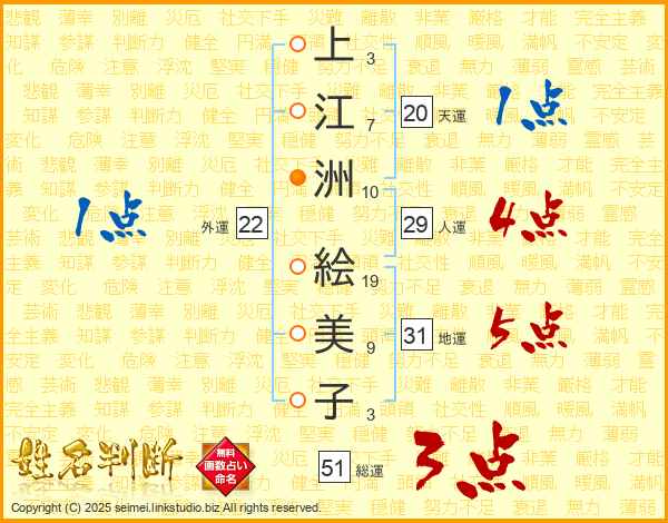 上(3画)江(7画)洲(10画) 絵(19画)美(9画)子(3画)