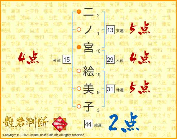 二(2画)ノ(1画)宮(10画) 絵(19画)美(9画)子(3画)