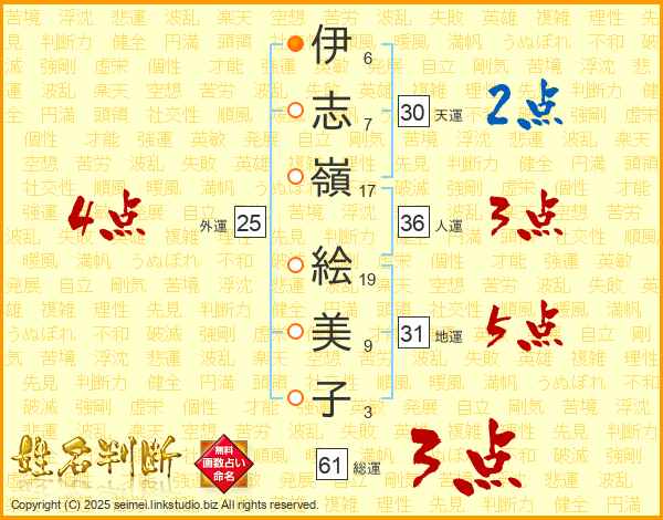 伊(6画)志(7画)嶺(17画) 絵(19画)美(9画)子(3画)
