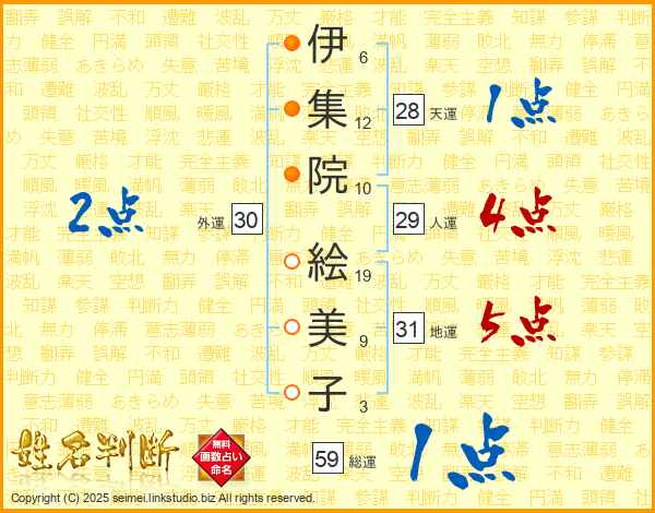 伊(6画)集(12画)院(10画) 絵(19画)美(9画)子(3画)