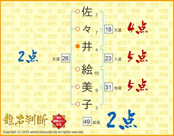 佐(7画)々(7画)井(4画) 絵(19画)美(9画)子(3画)