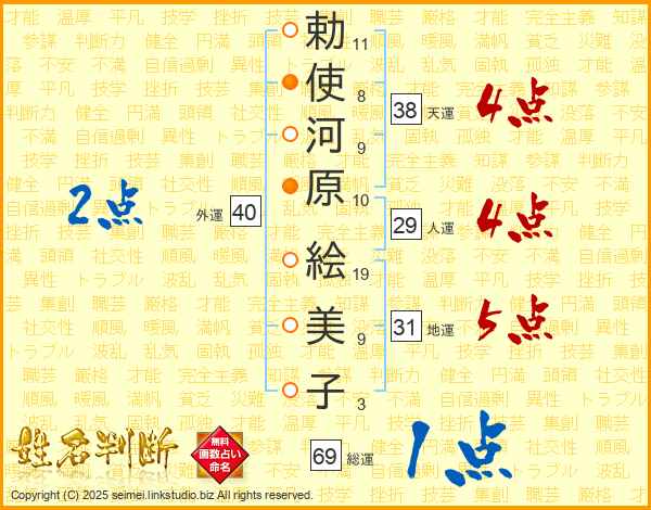 勅使河原絵美子さんの天運は38画の4点!
