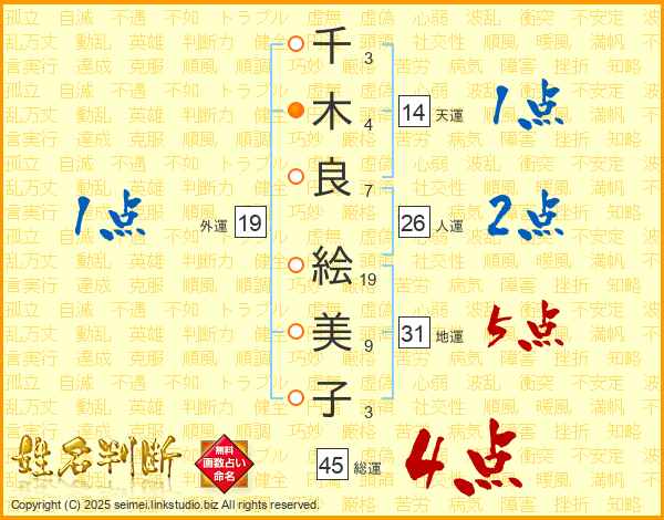 千(3画)木(4画)良(7画) 絵(19画)美(9画)子(3画)