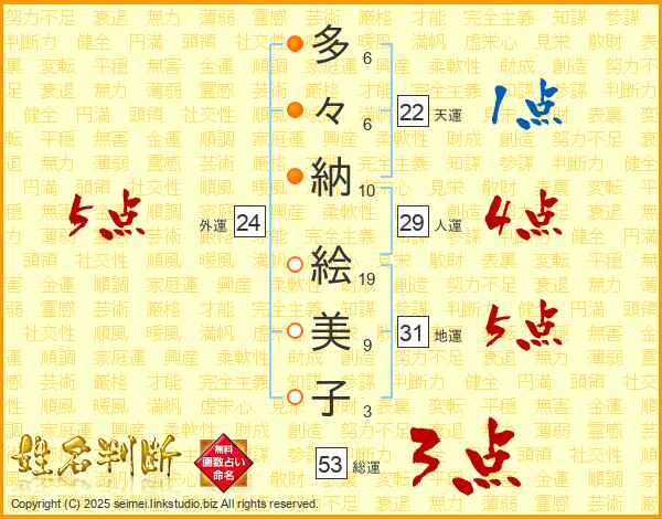 多(6画)々(6画)納(10画) 絵(19画)美(9画)子(3画)