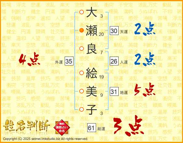 大(3画)瀬(20画)良(7画) 絵(19画)美(9画)子(3画)