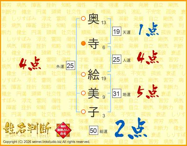 奥(13画)寺(6画) 絵(19画)美(9画)子(3画)
