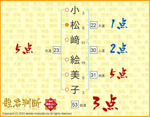 小(3画)松(8画)﨑(11画) 絵(19画)美(9画)子(3画)