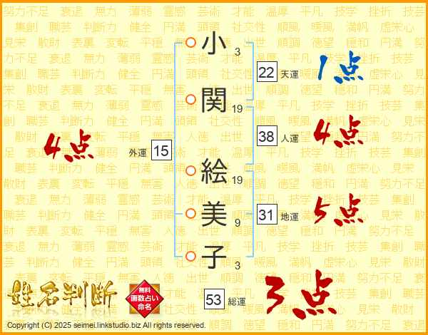 小(3画)関(19画) 絵(19画)美(9画)子(3画)