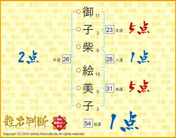 御(11画)子(3画)柴(9画) 絵(19画)美(9画)子(3画)