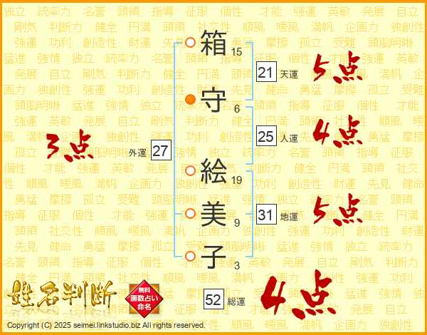 箱(15画)守(6画) 絵(19画)美(9画)子(3画)