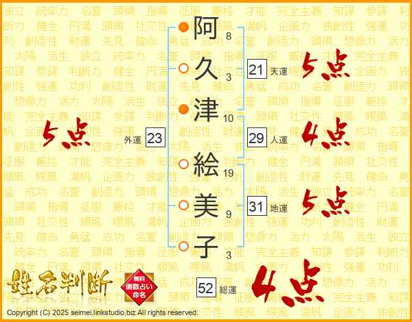 阿(8画)久(3画)津(10画) 絵(19画)美(9画)子(3画)